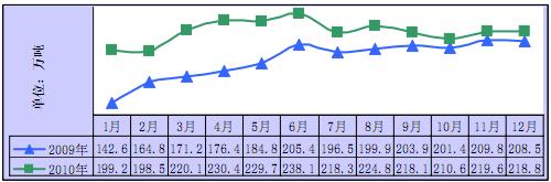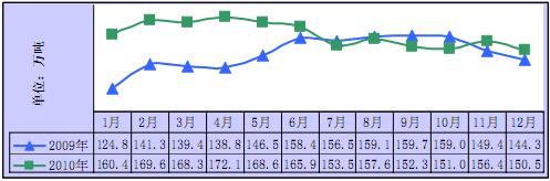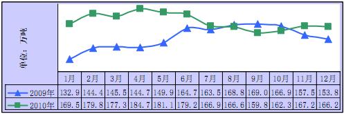 2010 年全年累計,生鐵、粗鋼和鋼材產量分別為 5.90 億噸、6.27 億噸和 7.96 億噸,同比分別增長 7.4%、9.3%和 14.7%,增幅分別比 2009 年回落 8.5 個百分點、4.2 個百分點和3.8 個百分點。