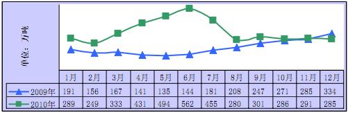 據海關快報統計,12 月我國進口鋼材 141 萬噸,同比下降 4.94%,環比增加 3 萬噸;出口鋼材 285 萬噸,同比下降 14.54%,環比減少 6 萬噸;凈出口鋼材 144 萬噸,同比下降22.24%,環比減少 9 萬噸;2010 年全年累計進口鋼材 1643萬噸,同比下降 6.82%,累計出口鋼材 4256萬噸,同比增長 73.03%,累計凈出口 2613 萬噸,同比增長 2.75 倍。