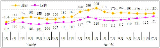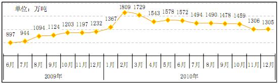 據印度國家礦業開發公司一位負責人透露,該公司出口鐵礦石價格將從 2011 年 1 月起上調 3%,該價格將適用整個第一季度,但并未正式公布,隨后又有報道稱,印度政府計劃在 2011 年 4 月 1 日開始的 2011-2012 財政年度對鐵礦石出口統一加征 20%的出口關稅,將進一步推高國際礦價。另據路透社報道,巴西礦業巨頭淡水河谷 2011 年 1 月料將季度鐵礦石合約價格提高 8.8%,至每噸 149.20 美元,這一漲幅是根據上期(2010 年 9 月 1 日-11 月30 日)普氏指數的漲幅確定的。2011 年第一季度鐵礦石價格上漲已成定局。正是基于對鐵礦石漲價的預期,鋼廠、貿易商早已做好了囤貨準備,2010 年 11 月鐵礦石進口量較 10 月份增長 25.5%,至 5738 萬噸,12 月進口量繼續微量增長,達到 5808 萬噸,國內鐵礦石庫存持續上升, 據蘭格鋼鐵網數據, 截至 1 月7 日, 全國 19 個主要港口鐵礦石庫存量升至 8090萬噸。進口礦的激增導致鐵礦石市場持續追漲,短期內推高了鋼價,然而,2011 年鋼鐵需求具有很大的不確定性,且第一季度是用鋼淡季,鋼廠轉嫁成本壓力可謂困難重重。