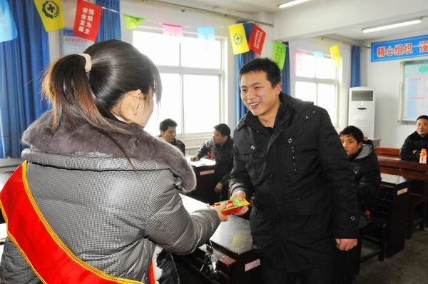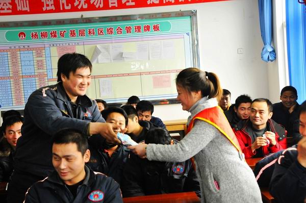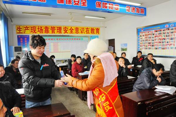 2月10日上午,楊柳礦工會組織青崗員、婦女協安員16人分成8個小組來到綜采一區、綜掘一區、基建一區、修護區、保運區、運輸區、通風區、防突區等八家單位的安全例會上,開展“學習‘一號文’、緊繃安全弦”知識競答活動。知識競答題目以礦《關于加強2011年安全生產工作的決定》和《楊柳煤礦“三違”整治實施辦法》兩個文件內容為主。活動中,對回答正確的職工,工作人員為他們送上了香皂、洗衣粉等小獎品;回答錯誤的題目,則由協安員復述一遍,并囑咐職工牢記。活動形式靈活,寓教于樂,深受廣大職工喜愛,大家紛紛踴躍參加競答,使大家在輕松愉悅的氛圍中又一次接受了安全學習。( 楊柳礦:姜衛)