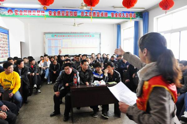 3月17日,楊柳礦協安員來到運輸區安全例會上開展安全問答活動。楊柳礦工會深入開展“建功十二五,巾幗保安全”協安主題活動,不斷豐富活動載體,經常性的深入基層區隊開展形式新穎、寓教于樂的活動,充分發揮安全生產第二道防線的作用。(楊柳礦:姜衛)