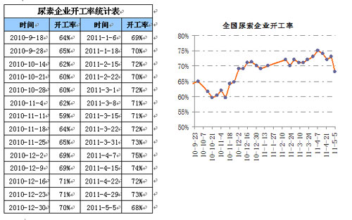 其次,國內企業開工率也被看作是供貨不足從而拉動價格重要因素。誠然,從近兩周國內企業開工情況來看,北方不斷有廠家在安排檢修。如下圖所示,四月底之五月初,全國整體開工率下滑了五個百分點。因此,也有很多商家擔心開工率過低會引發供貨緊張,進而支撐尿素價格持續高位。