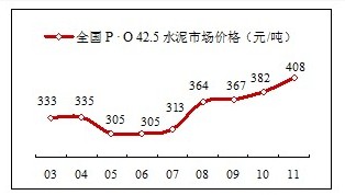 2011年水泥市場仍然延續高需求、高供給的市場運行軌跡,但和往年最大的不同是,價格曲線有了很大變化,就全國范圍講, 價格已脫離了長期在運行在300元/噸的低價軌道,2008年以后,一是4萬億投資拉動了市場需求,二是借煤炭價格的上漲,在水泥大企業的帶動下較好地轉移了上游的上漲成本,水泥價格開始向400元/噸沖擊。可以說這是進入”十二五”對水泥產業的最大利好。水泥產業擺脫了長期以來市場低迷得尷尬境地,上游、下游價格上漲,水泥價格原地踏步,甚至走低,使產業的發展受到了嚴重挑戰。在10年水泥工業高速發展中成長起來的兩位”大佬”海螺郭文叁、中國建材宋志平攜手進入”十二五”,都認為未來10年是水泥發展的黃金10年。
