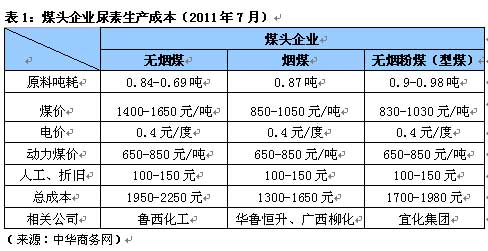 表1分別從無(wú)煙煤(小塊、中快、大塊)、煙煤以及無(wú)煙粉煤把煤頭尿素企業(yè)分為三類。從結(jié)果可以看出:使用無(wú)煙塊煤為原料的企業(yè)每噸尿素成本控制在1950-2250元/噸,有些甚至更高;無(wú)煙粉煤略低為1700-1980元/噸。當(dāng)然,這些成本核算是在晉煤在7月將無(wú)煙煤價(jià)格上調(diào)30-50元之后所得出的結(jié)果。表中可以看出:使用煙煤的成本最低,但由于大面積推廣煙煤技術(shù)有一定難度,所以這部分企業(yè)所占比例極小。絕大多數(shù)的尿素企業(yè)還是那些高成本工藝,且要占到全國(guó)煤頭企業(yè)的60%以上。