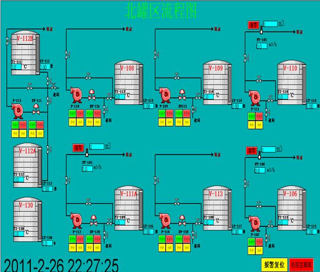 此系統(tǒng)主要控制三個(gè)灌區(qū)分別是北罐區(qū)、南罐區(qū)、舊罐區(qū),每個(gè)罐區(qū)都對(duì)應(yīng)不同的泵和閥門,罐區(qū)內(nèi)裝車都有計(jì)量系統(tǒng),當(dāng)計(jì)量流量發(fā)出到達(dá)信號(hào)時(shí)相對(duì)應(yīng)的閥門和泵關(guān)閉,同時(shí)當(dāng)每個(gè)罐區(qū)內(nèi)液位、溫度出現(xiàn)低報(bào)警、低低報(bào)警、高報(bào)警、高高報(bào)警時(shí)進(jìn)行相應(yīng)的連鎖動(dòng)作。
