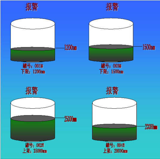 狀態(tài)報(bào)警是顯示罐內(nèi)液位超限位的狀態(tài),如罐號(hào)設(shè)定的上/下限值及液位實(shí)時(shí)值,例如:當(dāng)液位低于下限一定值時(shí)表示油罐已空,高于一定值時(shí)油罐已滿,并根據(jù)需求設(shè)定遠(yuǎn)端報(bào)警,趨勢(shì)圖可實(shí)時(shí)顯示溫度及液位的趨勢(shì)狀態(tài),報(bào)警信息如圖3-2所示。
