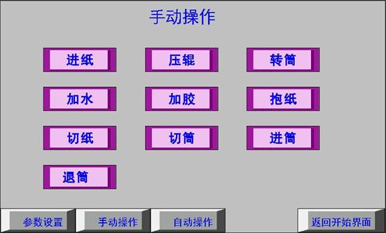 花炮卷筒機的動作主要有:送紙、壓輥、抱紙、卷筒、加水、加膠、切紙、切筒、進筒燈一系列工序。根據工序的特點,在PLC的控制程序里有手動和自動控制兩種控制模式。在手動控制模式下,可以單獨對每一個工序的動作進行控制;當切換到自動控制模式,PLC程序會根據預先設置好的流程來控制卷筒機工作,不需要人工干預。所有的這些手動操作和手/自動信號的切換都是通過觸摸屏進行的。