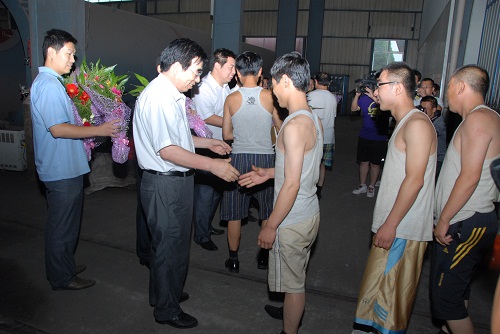 上圖:磐石容器集團董事長李德平親自為參加完實驗走出救生艙的十名志愿者獻鮮花
