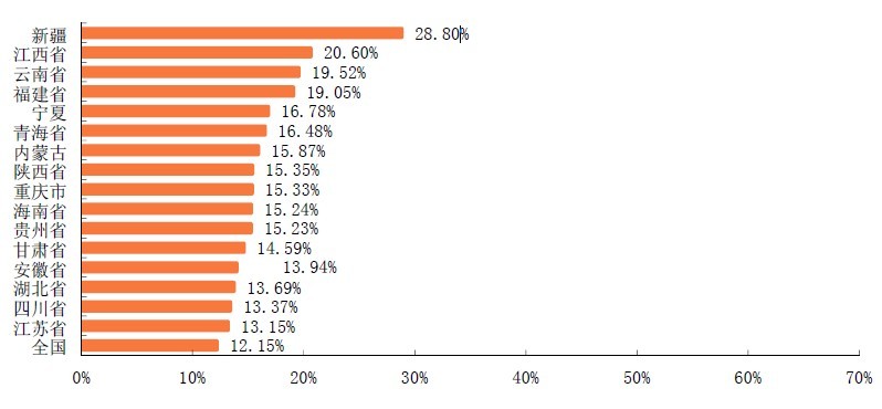 圖表3 7月新疆、江西、福建等省用電增速居前列單位:%