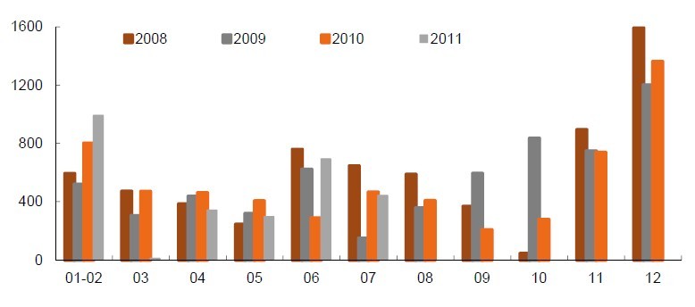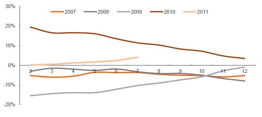 1-7月份,全國新增火電投產2774萬千瓦左右,較去年同期增長5%左右。7月份單月火電新投產443萬千瓦,較去年同期略為下滑4.7%左右。自6月份發改委表示將加快火電審批速度后,火電投產速度明顯較今年前5個月有所加快。1-7月份,全國新增風電投產裝機563萬千瓦左右,較去年同期增長37.6%左右。
