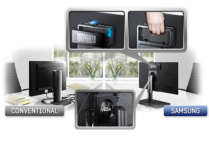 三星智翼CA650定位于商務辦公人群,它的外觀大方、沉穩,其底座幾乎則提供了所有調節功能,其中包括左右旋轉、俯仰角、支持橫豎屏、150mm的高低調節范圍,這讓使用者可以根據需要顯示的內容和使用的舒適度情況,任意調節顯示器的角度和高度。