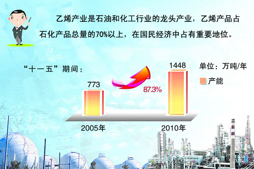 “可以說從‘十一五’開始,我國乙烯產業大步向大型化、基地化、產業鏈化方向發展。乙烯產能的快速增加帶動了下游合成樹脂、合成纖維等產業的發展。”大宗商品交易平臺——金銀島的石化分析師王貞賢說,“‘十一五’期間,我國乙烯產能維持穩定增長,從2005年的773萬噸/年增長至2010年的1448萬噸/年,增幅達87.3%,目前僅次于美國,居世界第二位。”