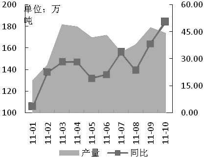 產量方面,2011年10月中國甲醇總產量173.56萬噸,比上月減少2.63%,比去年同期增加50.2%。2011年1—10月份,中國累計生產甲醇1675.08萬噸,比2010年同期增加28.4%。