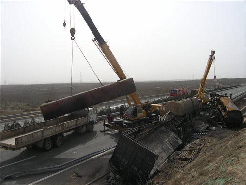 隨后,中隊官兵利用車載泡沫撲滅明火,同時對車輛實施冷卻控制。此時罐車油箱已經燒毀,隨后,消防官兵對起火的拉煤車進行撲救,與交警組織群眾轉移煤以防火勢蔓延。于10時32分成功撲滅火災。此次事故中,后一輛拉煤車駕駛室完全燒毀,死亡一人。