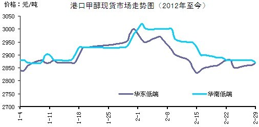 2011年以來,港口甲醇市場呈現倒“V”字型走勢,價格于2月初達至高點,此后開始回落。截止2月底,華東地區(qū)收于2870-2980元/噸,價格較1月初小幅回升1.5%;華南2870-28元/噸,較1月初基本持平。