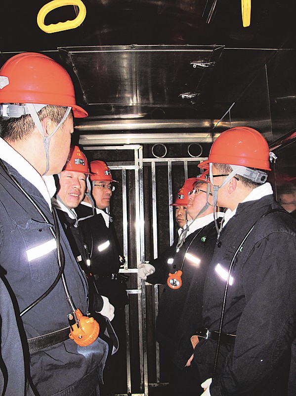 入井口猶如賓館的大廳,雪白的地板磚一塵不染,幾乎能照出人影,兩側是各種企業文化、安全常識的展板,以及各種有關煤的工藝品。走過“洗靴池”,記者和礦工們依次登上罐籠直線而下,“罐籠”是運送礦工下井的升降梯,大約不到一分鐘,罐籠就把我們送到了地下300米的井底。