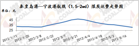 華東沿海煤炭運輸市場方面:本周國內(nèi)沿海煤炭運價延續(xù)跌勢,連跌9周。本周自5月21日至5月25日,秦皇島港至寧波港(1.5-2萬噸)煤炭海運費再降1.1元/噸至30.5元/噸;秦皇島港至上海港(4-5萬噸)煤炭運費繼續(xù)下探1.3元/噸至27.7元/噸;秦皇島港至張家港(2-3萬噸)煤炭運費再下滑1.1元/噸至31.4元/噸。