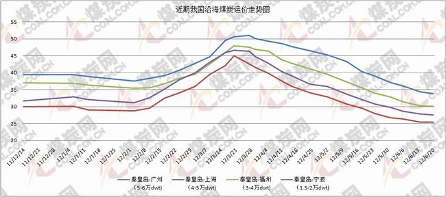 沿海運(yùn)費(fèi):本周國內(nèi)沿海煤炭運(yùn)費(fèi)繼續(xù)小幅下滑,運(yùn)價(jià)有止跌企穩(wěn)的跡象。截止到6月20日,秦皇島-廣州(5-6萬DWT)運(yùn)價(jià)33.8萬噸,較14日下跌0.6元;秦皇島-福州(3-4萬DWT)運(yùn)價(jià)30.1元/噸,較上期下跌0.1元;天津-上海(2-3萬DWT)運(yùn)價(jià)26.3元/噸,較上期下跌0.5元;天津-鎮(zhèn)江(1-1.5萬DWT)運(yùn)價(jià)32.7 元/噸,較上期下跌0.3元;秦皇島-寧波(1.5-2-6萬DWT)運(yùn)價(jià)27.6元/噸,較上期下跌0.2元。受當(dāng)前國內(nèi)宏觀經(jīng)濟(jì)影響,市場對(duì)電煤的需求下降,導(dǎo)致到港船舶數(shù)量減少,各港口煤炭碼頭泊位均出現(xiàn)不同程度的“空泊”現(xiàn)象,從而導(dǎo)致港口煤炭下水量減少。下游企業(yè)派船采購的積極性不足,加之受船舶運(yùn)輸成本的支撐,沿海煤炭運(yùn)價(jià)將在底部震蕩。