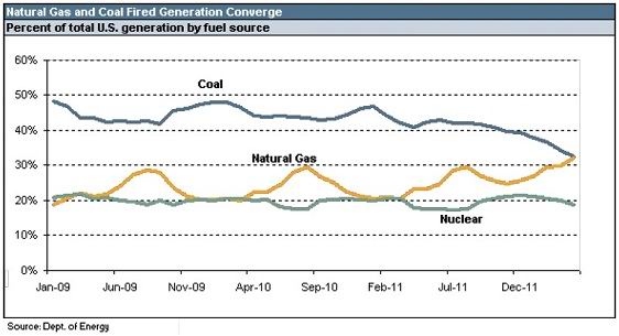 天然氣發電量占比增長的原因很明顯:壓裂技術加上異常溫暖的氣候。