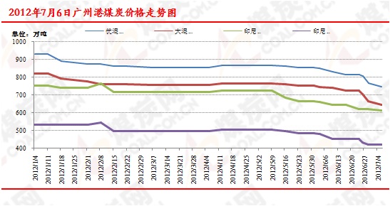 本周華南地區煤炭市場呈現弱勢穩定態勢,市場成交情況一般,港口存煤始終處于較高水平。本周北方沿海地區動力煤價格自此大幅下跌,其中秦皇島港口Q5500大卡動力煤平倉價660-675元/噸,較上期下跌25元;Q5000大卡動力煤平倉價555-565元/噸,較上期下跌25元;Q4500大卡動力煤平倉價470-480元/噸,較上期下跌25元。截止到7月8日,港口存煤857.4萬噸,環比保持保持不變。此次動力煤價格的繼續下挫主要還是由于供求矛盾的加劇、下游企業的高位庫存、以及夏季用煤高峰市場的疲軟以及受煤價持續下跌的影響部分煤炭成產企業大幅降價,從而對導致市場的愈發悲觀、恐慌情緒。截止到7月初,全國重點電廠存煤高達9124萬噸,存煤可用天數為27天,其中廣東電網存煤可用天數為23天。本周華南地區煉焦煤市場繼續弱勢運行,無煙煤市場運行穩定,需求不旺。