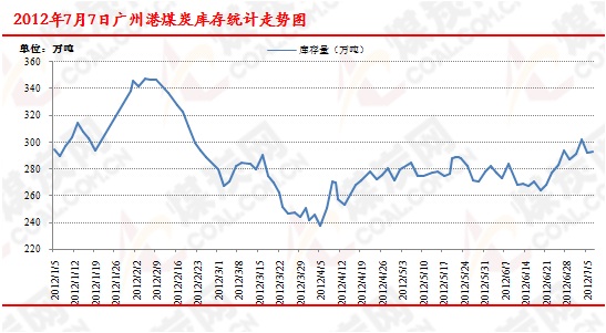港口庫存方面:煤炭網信息研究中心數據顯示,截止到7月8日,廣州港存煤284.56萬噸,周環比減少6.4萬噸。其中新沙公司存煤148萬噸;環比增加2萬噸;西基公司存煤52萬噸,環比減少8萬噸;新港公司存煤14.78萬噸,環比減少0.19萬噸;黃埔公司存煤69.77萬噸,環比減少0.21萬噸。