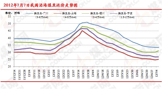 沿海運費:本周國內沿海煤炭運費逐漸止跌企穩,但是當前沿海煤炭運輸市場形勢依然嚴峻,運力需求依舊不足,市場反彈動力不足。截止到7月6日,秦皇島-廣州(5-6萬DWT)運價33.4萬噸,與2日相比價格保持不變;秦皇島-福州(3-4萬DWT)運價31.1元/噸,較上期上漲1元;天津-上海(2-3萬DWT)運價26元/噸,較上期上漲0.3元;天津-鎮江(1-1.5萬DWT)運價32.4 元/噸,較上期上漲0.3元;秦皇島-寧波(1.5-2-6萬DWT)運價26.7元/噸,較上期保持不變。本周沿海運輸市場止跌企穩,部分航線運價有小幅回升,但是由于下游需求不佳,大量船舶處于拋錨停運的狀態,整個航運市場運力過剩的狀況依然嚴峻。
