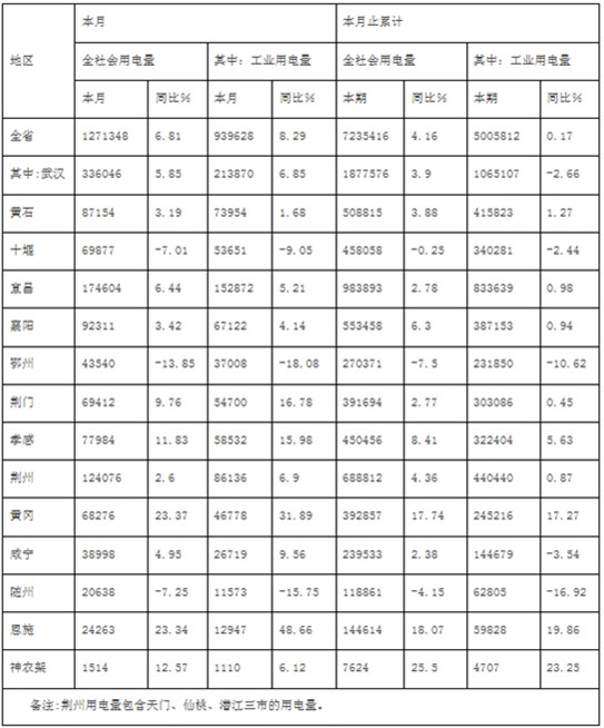 (四)各地全社會及工業用電大部分保持增長,但工業用電增幅普遍低于全社會,部分地市重點行業對當地用電增速產生較大影響。上半年全省13個市(州)中,除十堰、鄂州、隨州3市用電下降外,武漢等10市(州)用電不同程度增長,其中,黃岡、恩施兩市(州)用電增幅分別為17.74%、18.07%。從全社會與工業用電增幅關系上看,除恩施州工業用電增幅高于全社會外,其他12個市工業用電增幅均低于全社會。傳統工業城市中,武漢上半年工業用電下降2.66%,宜昌、荊州、襄陽、黃石等工業用電增幅也僅為0.87至1.27個百分點,此5市鋼鐵、有色、汽車等重工業用電趨緩對當地工業用電增速產生不同程度的影響。