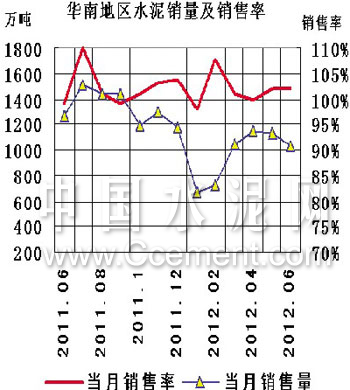 6月華南地區匯總水泥企業60家,生產水泥1002.75萬噸,同期比下降14.15%,減少水泥產量165.26萬噸,累計產量5437.36萬噸,同比下降3.35%;6月銷售水泥1023.75萬噸,同比增長2.36%,比去年同期多水泥銷售23.57萬噸,累計銷售水泥5520.02萬噸,同比下降4.10%。6月水泥銷售率102.09%,環比下降0.35個百分點;6月水泥庫存314.91萬噸,同比增長了5.71%。