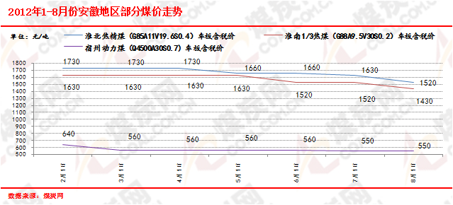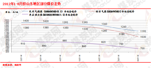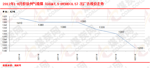 2012年初至今,華東煤炭市場整體呈現出由穩到弱勢持續下行的趨勢,尤其是近3個月,市場下行震蕩更加頻繁明顯。受大的經濟環境增速放緩、下游基礎能源消費低位的影響,加上進口煤沖擊,造成煤炭供給過剩,國內港口動力煤價格連跌不止,進而傳導至產地坑口,華東地區自然“難以幸免”,山東、安徽、江蘇等地煤企頻頻下調煤價,以期能夠刺激下游需求,徐礦氣精煤(G63A8V38)出廠含稅價上半年下跌了近210元/噸(如下圖),兗礦精煤下調了近260元/噸(如下圖),3月份至今,棗莊5500大卡動力煤車板價也有200元/噸以上的下跌。但調價的實際結果卻收效甚微,即使是到了“迎峰度夏”的用煤高峰期,動力煤下游需求并不見明顯回升,各個環節的存煤量均在高位,“去庫存”仍在過程當中,現安徽省內電煤供應充足,電廠存煤保持在269萬噸,平均可用15日天以上,煤企庫存高位,存煤150萬噸;山東地區電廠電煤庫存也在30天左右的高位。