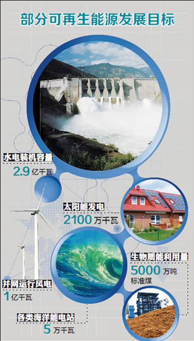“十二五”時期我國可再生能源發展的總體目標是:到2015年,可再生能源年利用量達到4.78億噸標準煤,其中商品化年利用量達到4億噸標準煤,在能源消費中的比重達到9.5%以上。