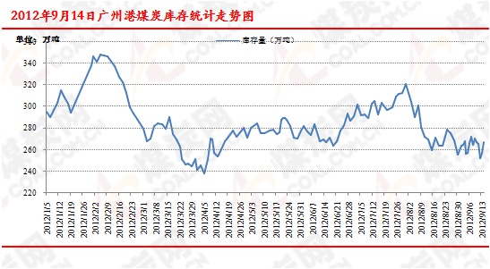 港口庫存方面:煤炭網信息研究中心數據顯示,9月14日,廣州港存煤266.61萬噸,較上周同期減少5.51萬噸。其中新沙公司存煤129萬噸;周環比減少9萬噸;西基公司存煤62萬噸,環比增加6萬噸;新港公司存煤4萬噸,環比減少4.8萬噸;黃埔公司存煤71.58萬噸,環比增加2.34萬噸。