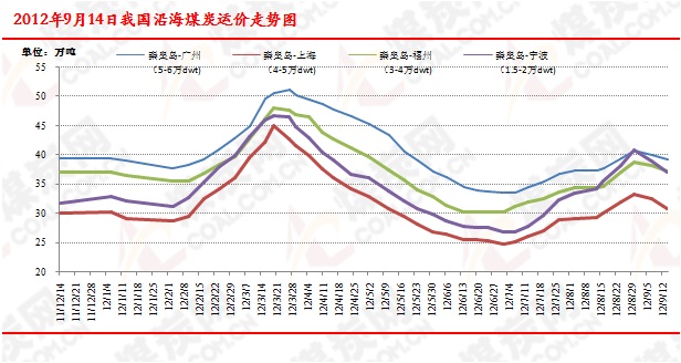 沿海運費:截止到9月14日,現秦皇島港-廣州港(5-6萬DWT)運費39.1元/噸,周環比下跌0.9元;秦皇島-福州(3-4萬DWT)運費37.1元/噸,周環比下跌1元。天津-上海(2-3萬DWT)運價34.6元/噸,周環比回落1.5元;天津-鎮江(1-1.5萬DWT)運價43.5元/噸,周環比回落0.3元;秦皇島-寧波(1.5-2萬DWT)運價36.9元/噸,周環比回落2元。華南航線因前期漲幅較小,因此目前價格仍比較堅挺,跌幅較小。近期,下游電廠日耗維持低位運行,只是電廠存煤水平有所上升,下游采購熱情有所下降。目前航運市場運價受市場制約影響明顯,觀望情緒蔓延,不過后期隨著大秦線檢修日子的確定,以及冬儲煤的進行,下游耗煤企業對電煤的需求將會有所上升,從而帶動航運市場的回暖,預計后期沿海運價將會有所回暖。