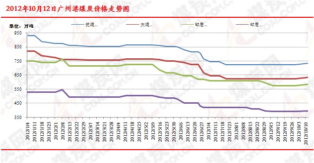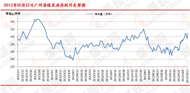 港口庫存方面:煤炭網信息研究中心數據顯示,10月12日,廣州港存煤308.78萬噸,周環比增加16.23萬噸。其中新沙公司存煤172萬噸;周環比增加13萬噸;西基公司存煤67萬噸,環比增加4萬噸;新港公司存煤11.1萬噸,環比增加2.18萬噸;黃埔公司存煤58.6萬噸,環比減少8萬噸。