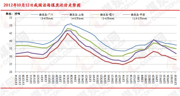 沿海運費:截止到10月12日,現秦皇島港-廣州港(5-6萬DWT)運費37.2元/噸,周環比下跌1元;秦皇島-福州(3-4萬DWT)運費34.9元/噸,周環比下跌1.1元。天津-上海(2-3萬DWT)運價30.9元/噸,周環比回落1.7元;天津-鎮江(1-1.5萬DWT)運價37.6元/噸,周環比回落3元;秦皇島-寧波(1.5-2萬DWT)運價31.7元/噸,周環比回落2.8元。主要由于節日期間,多數交易商處于休假狀態,市場成交較為清淡。其次下游電廠目前受天氣適宜影響休假調整,電廠日耗持續低溫運行,影響后續電煤需求的釋放,極大的制約了拉煤的積極性。目前隨著10月8日大秦線檢修的開始,北方港口庫存開始陸續下降,部分優質煤種供求緊張的矛盾將繼續加劇,短期內航運市場或將持續低迷。