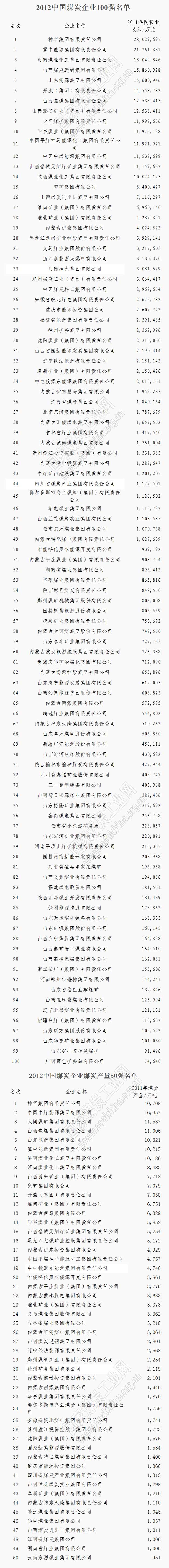 中國煤炭工業協會分別向社會發布了2012中國煤炭企業100強和2012中國煤炭企業煤炭產量50強名單。