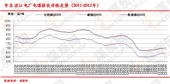 下游華東電廠動力煤接收價格維持穩定,隨著冬季提前供暖開始下游冬儲煤的進行,動力煤市場仍能受短期支撐并存在短期成交良好空間。實際目前下游用戶庫存飽滿,幾乎不存在大量采購煤炭的可能性。最新數據顯示,2012年11月上旬,太倉華能、南通華能、上海石洞二電廠接收5000、5500、5800大卡大同煤價格分別為605元/噸、690元/噸、735元/噸;夏港電廠、揚州二電接收5000、5500大卡蒙煤價格分別為610元/噸、695元/噸。上海石洞一廠、南通天生港電廠接收5000、5500大卡貧瘦煤價格分別為590元/噸、640元/噸,較上一期均上漲5元。