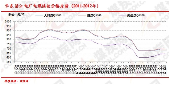 電廠發電量和日耗煤量有所下降。受經濟形勢的影響,鎮海電廠今年的發電量和日耗煤量均呈現下降的態勢。1-10月該廠共發電37.7億度,比去年同期減少8.3億度。10月份該廠共耗煤10.6萬噸,同比減少0.6萬噸。1-10月份共耗煤113.8萬噸,同比減少27.2萬噸。據浙能集團統計,10月份日均耗煤量為10.3萬噸,同減0.8萬噸。當前浙能系統存煤量達388萬噸,同比增長60萬噸,仍處于較高水平。最新數據顯示,2012年11月上旬,太倉華能、南通華能、上海石洞二電廠接收5000、5500、5800大卡大同煤價格分別為605元/噸、690元/噸、735元/噸;夏港電廠、揚州二電接收5000、5500大卡蒙煤價格分別為610元/噸、695元/噸。上海石洞一廠、南通天生港電廠接收5000、5500大卡貧瘦煤價格分別為590元/噸、640元/噸,較上一期均上漲5元。