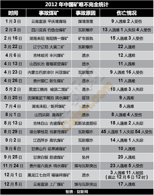 回顧過去的11個(gè)月,“礦難”依然是貫穿2012年的高頻字眼。1月3日,同樣是在云南富源,一起礦難事故奪去9名礦工的生命。財(cái)新網(wǎng)整理了今年發(fā)生的導(dǎo)致傷亡人數(shù)較多的礦難事故如下: