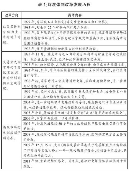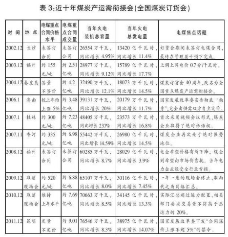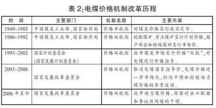 我國煤炭體制改革發(fā)展歷程大概經(jīng)歷了三個(gè)階段:1949~1992年,以國家計(jì)劃分配為主,市場調(diào)節(jié)為輔;1993~2002年,計(jì)劃分配向市場配置資源過渡,運(yùn)力計(jì)劃由國家宏觀管理;2002年至今,煤炭市場化體制機(jī)制不斷完善。(詳見表1)我國電煤價(jià)格機(jī)制改革歷程和煤炭體制改革發(fā)展大體同步,細(xì)分開來,經(jīng)歷了五個(gè)階段:1949~1985年,由國家制定煤炭價(jià)格,實(shí)行價(jià)格單軌制,這一時(shí)期的煤炭價(jià)格既不反映價(jià)值,也不反映供求關(guān)系;1986~1992年,國家控制大部分煤炭價(jià)格,實(shí)行價(jià)格雙軌制,全國統(tǒng)配煤礦、重點(diǎn)煤礦的煤炭,實(shí)行統(tǒng)一的計(jì)劃價(jià)格,超產(chǎn)部分實(shí)施加價(jià),特殊煤種實(shí)行市場價(jià);1993~2002年,煤炭價(jià)格向市場化過渡,隨著煤炭產(chǎn)量大幅增加,特別是市場化改革進(jìn)程加快,國家逐漸放開了除發(fā)電用煤以外的煤炭價(jià)格;2003~2006年,國家取消對電煤的國家指導(dǎo)價(jià),煤炭產(chǎn)品的價(jià)格主要由市場供需關(guān)系決定,但由于多重因素影響,電煤價(jià)格雙軌制以及電煤由政府指導(dǎo)定價(jià)的現(xiàn)實(shí)仍然沒有根本性改變;2006年至今,國家決定全部放開電煤價(jià)格后,但重點(diǎn)合同電煤價(jià)格與市場煤價(jià)格的差距仍非常大。(詳見表2)全國煤炭訂貨會 (又稱全國煤炭產(chǎn)運(yùn)需銜接會、匯總會)作為我國煤炭產(chǎn)運(yùn)需銜接配置的主要實(shí)現(xiàn)形式,已有50多年的歷史,會議的形式在不斷調(diào)整,內(nèi)容也在不斷變化,但“煤電頂牛”一直是焦點(diǎn)話題,尤其是2002年之后,矛盾更加突出。