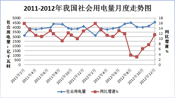1.電量增長先抑后揚,總體回落明顯。主要呈現出四個特征:一是電量增速明顯回落。根據國家能源局統計,2012年全社會用電量累計達49591億千瓦時,同比增長5.5%,增速較上年回落6.5個百分點,自2010年以來首次出現低于GDP增速。用電占比達到73.7%的第二產業用電量同比增長3.9%,對全社會用電增長的貢獻率僅為51%;而第三產業和居民用電增速分別達到11.5%和10.7%,對全社會用電增長的貢獻率合計達到49%。二是電力供需平衡寬松。由于用電需求增長趨緩,全國大部分地區未出現長時間高溫高濕天氣,同時水電出力快速增加,電煤供應狀況明顯好于上年,全國電力供需總體平穩,其中華北、華東、華中電力供需平衡,西北、東北電力供應有富余,僅南方電網上半年受干旱影響電力供需形勢偏緊,最大電力缺口達到653萬千瓦。三是電量增長先抑后揚。2012年進入二季度,全社會用電增幅急速回落,火電機組利用小時加速下滑,一、二、三季度受經濟結構調整、經濟增速趨緩的影響,全社會用電增速分別為6.8%、4.3%和3.9%,呈逐季回落態勢,相比2010年、2011年而言,用電量增速基本在低谷徘徊。以10月份為分界線,隨著國內經濟溫和復蘇,全社會用電量增速開始回升,重工業生產運行提速,火電發電量增加較快,10、11、12月份,當月用電增速回升到6.1%、7.6%和8.9%,四季度用電增速顯著上升,拉動了全年全社會用電量同比增速企穩小幅回升。四是火電發電量低速增長,水電發電量快速增長。根據電監會統計,2012年全國發電量4.96萬億千瓦時,同比增長5.5%,增速較上年下降6.51個百分點;痣姲l電量自11月份開始才結束了4月份以來的持續負增長態勢,全年達到3.91萬億千瓦時,同比僅增長0.3%;水電發電量8641億千瓦時,同比增長29.3%。