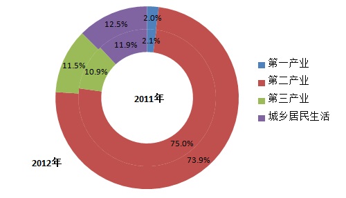 圖2 2011、2012年電力消費(fèi)結(jié)構(gòu)圖
