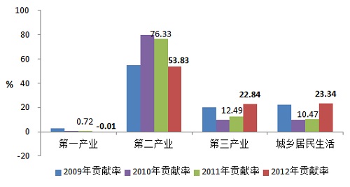 圖3 2009-2012年各產(chǎn)業(yè)及居民用電對(duì)全社會(huì)用電增長(zhǎng)貢獻(xiàn)率圖