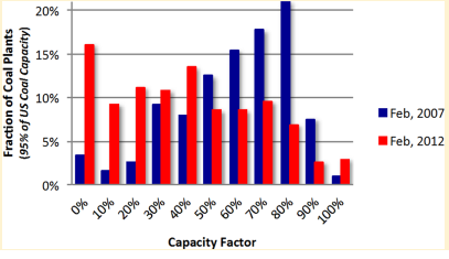 下圖直觀地總結了正在發生的轉變,許多燃煤電廠2012年的利用率都遠不及2007年: