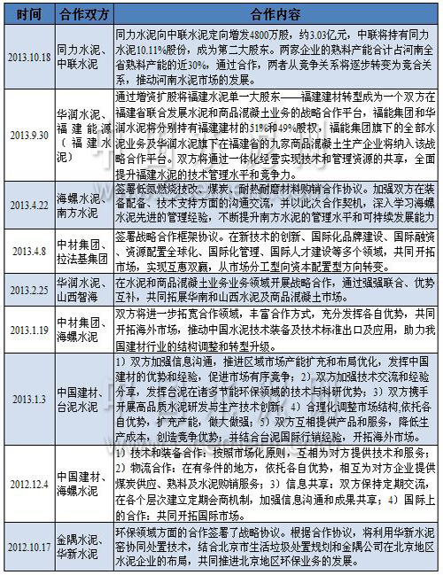 在各行各業中企業間簽訂戰略合作協議結成戰略盟友的歷來有之,但像水泥行業近期如此頻繁的卻實屬少見。根據2012年年底以來圍繞水泥行業簽訂的戰略合作協議,合作類型大致可分成以下三類:一是,水泥企業間強強聯手,如中國建材與海螺水泥、臺泥水泥,中材集團與拉法基集團等;二是,上下游企業間的協作,如海螺水泥與中鐵大橋局、華潤水泥與深圳天地集團等;三是,水泥企業與相關耗材企業的合作,甚至是物質采購、設備維修企業的合作,如昆鋼水泥與中材機電備件公司、中材節能與堯柏水泥等。