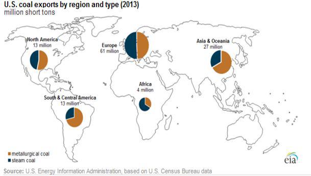 由于在未來15-20年內,亞洲煤炭消費量有望持續增加,這為美國煤炭生產商向亞洲市場出口煤炭創造了一個良好機會。筆者認為,皮博迪能源是美國處境最好的一家煤炭公司,亞洲煤炭需求增加將使其從中受益,因為它在澳大利亞擁有煤炭業務,這使其在滿足亞洲煤炭進口增長上更可行且更具成本效益。此外,其它美國煤炭公司如阿爾法自然資源、阿奇煤炭和沃爾特能源也應該致力于擴大對亞洲煤炭出口,從而從煤炭需求增長中受益。如果美國煤企可成功抓住亞洲煤炭進口增長這一契機,這將利好美國煤炭業未來發展。(下圖顯示了美國2013年煤炭出口情況。)