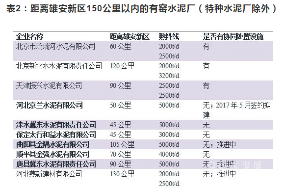 據公開資料,水泥窯協同處置已經形成了以華新(355.62元/噸,0%)、金隅(380元/噸,0%)、海螺(323.12元/噸,0.25%)為代表的三類技術處理類型。華新可在水泥廠建預處理設施,也可在距離水泥廠外150公里陸運范圍內建立預處理廠,金隅、海螺一般建在水泥廠,以處理周邊城鎮的垃圾為主。綜合來看,筆者認為,雄安新區垃圾或者污泥的運距不宜超過150公里,。根據中國水泥研究院數據,距離雄安新區150公里以內的具有熟料生產線的水泥廠(特種水泥廠除外)有10家,兩家位于北京市、一家位于天津市,7家位于河北省。其中,北京市的兩家已經具有協同處置能力,基本是處置本市垃圾,雄安新區的垃圾或污泥運送北京市的概率極低;天津振興水泥也建成了污泥示范線;河北的7家企業中尚沒有協同處置能力的企業,但是京蘭、曲陽金隅、唐縣冀東(320.67元/噸,0.63%)、燕新建材正在推動協同處置項目的上馬,不過多以協同處置危險廢物為主。另外,根據環保部《水泥窯協同處置固體廢物污染防治技術政策》要求,“新建、改建或擴建處置其他固體廢物的水泥企業,應選擇單線設計熟料生產規模 3000 噸/日及以上水泥窯”,因而除燕新建材外其余6家企業均有機會。