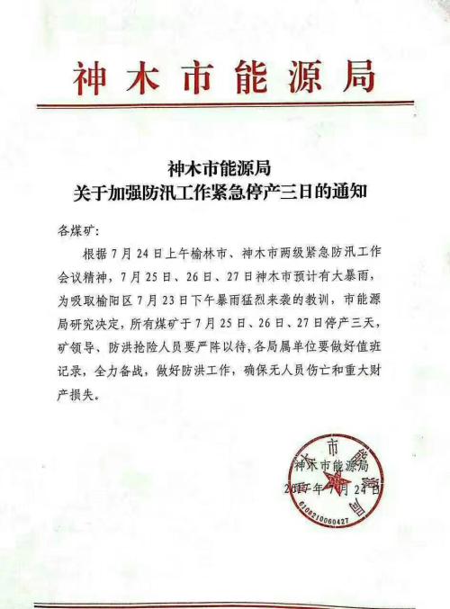 為吸取榆陽區7月23日下午暴雨猛烈來襲的教訓,神木市能源局絕對市內所有煤礦于7月25-27日三天緊急停產。具體文件如下:
