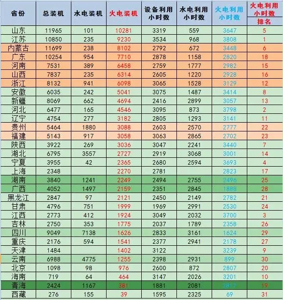 綜合各省火電裝機排名以及火電利用小時排名情況,作出以下判斷: