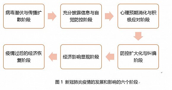 更詳細的疫情發展和影響可分為以下六個階段:病毒潛伏與傳播擴散階段、充分披露信息與自覺防控階段、心理預期消化與積極應對階段、防控擴大化與糾偏階段、經濟影響顯現階段、疫情過后的經濟恢復階段。