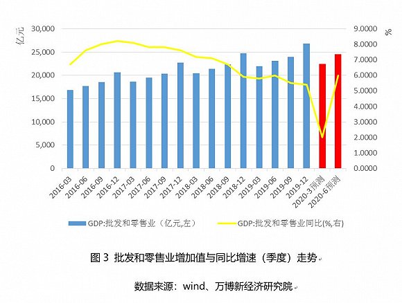批發零售業:預計三、四季度將全面恢復,同比增長均為5.8%,全年預計批零增加值為10.1萬億元,全年增速約為5%。
